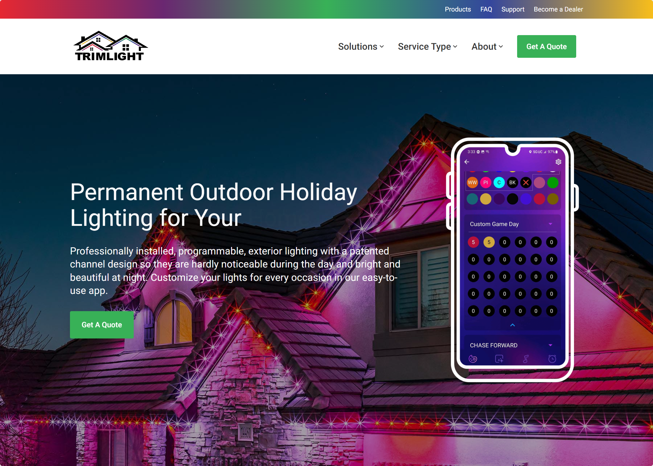 Trimlight offers cutting-edge LED lighting solutions built on a Hubspot platform with a sophisticated dealer search and assignment module. Their website ensures that clients can easily find and connect with dealers, streamlining the process of selecting and installing customized lighting setups.